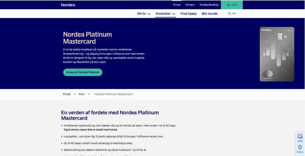 Nordea Platinum er Nordeas top-tier kreditkort, der er skræddersyet til dem, der rejser meget og har brug for de mest omfattende forsikringer og lifestyle-fordele, såsom Priority Pass adgang til lufthavnslounger.