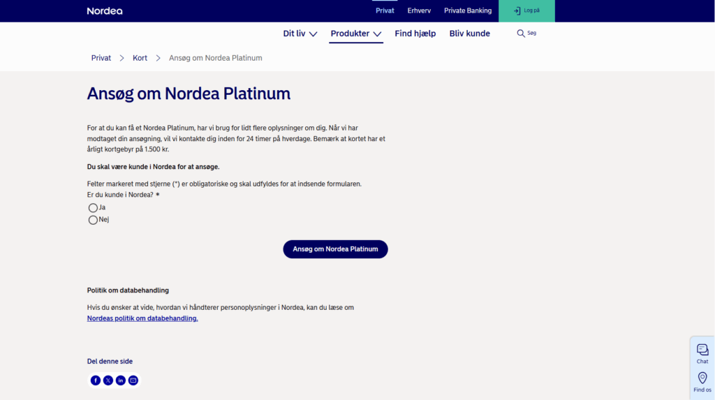 På produktsiden for Nordea Platinum finder du den direkte knap til ansøgning.
