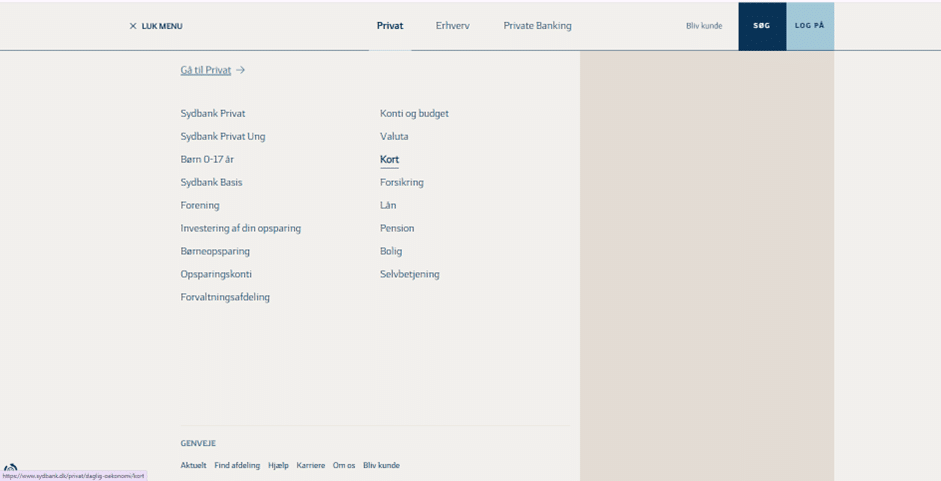 https://www.sydbank.dk/ - I hovedmenuen, klik på den første mulighed: “Privat”.