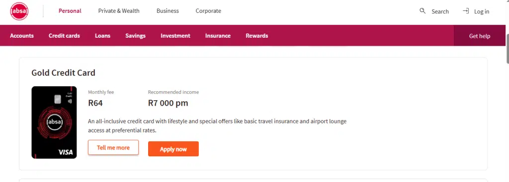 Now you’re on the comparison page, where you can view all the credit cards that Absa offers. You’ll find a variety of options, including: