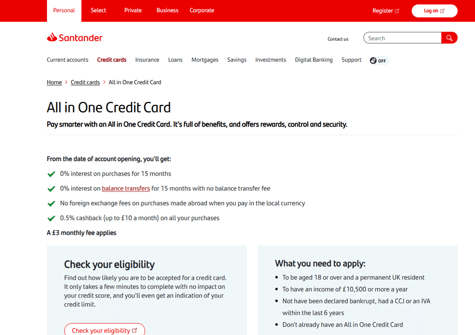 To start your application, you should visit the official Santander UK website. Navigate to the “Credit Cards” section and select the “All in One” option.