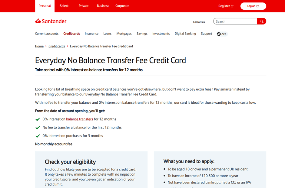 - Official Website: Go to the Santander UK website, navigate to the “Credit Cards” section, and find the “Everyday Credit Card”. Click on “Apply now” to start.