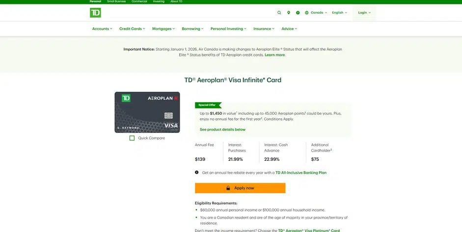 • TD® Aeroplan® Visa Infinite Card*, among others
