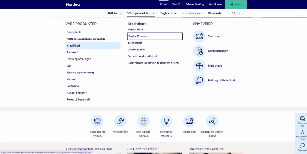 - Gå til seksjonen for kredittkort: Finn valget for å søke om Nordea Premium Mastercard.