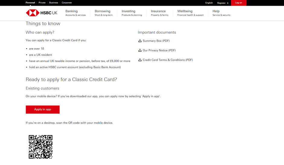 - Via Website (Browser): Go to the official HSBC UK Balance Transfer Credit Card page and select “Apply now” or “Apply in browser”. You will need to complete an online form with your personal details, employment status, and salary.