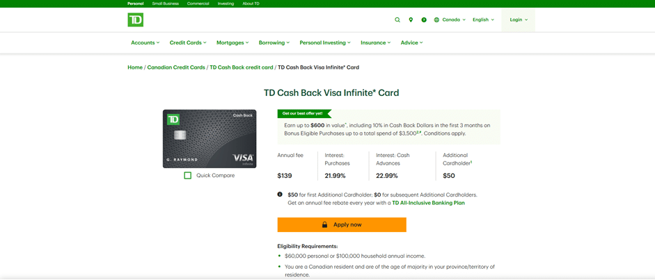 TD Cash Back Visa Infinite* Card Page