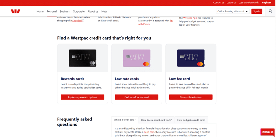 Westpac offers a range of banking products, including transaction and savings accounts, term deposits, home loans, credit cards, and personal loans.