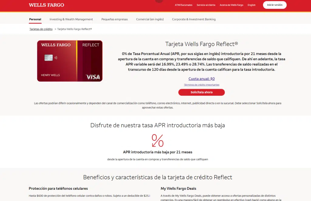 Solicitar la tarjeta de crédito Wells Fargo Reflect® es un proceso sencillo y seguro. Esta tarjeta ofrece 0% APR introductoria durante 21 meses en compras y transferencias de saldo, además de cuota anual de $0, siendo ideal para quienes buscan reducir intereses y administrar sus finanzas de forma eficiente.