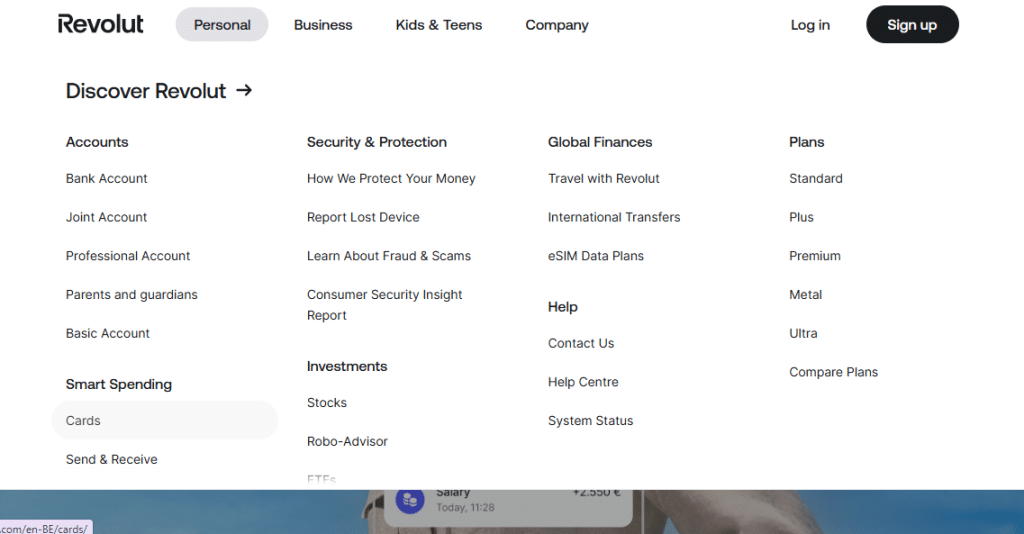 Dans le coin supérieur de l’écran, trouvez et cliquez sur le menu « Personal ». Ensuite, dans la première colonne qui apparaît, sélectionnez l’option « Cards ». Cela vous mènera directement à la page dédiée à tous les types de cartes Revolut.
