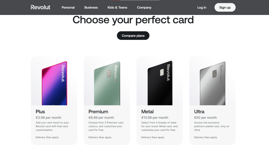 Revolut propose trois types de cartes : Standard, Premium et Metal. Chaque type de carte est conçue pour répondre à des besoins différents.