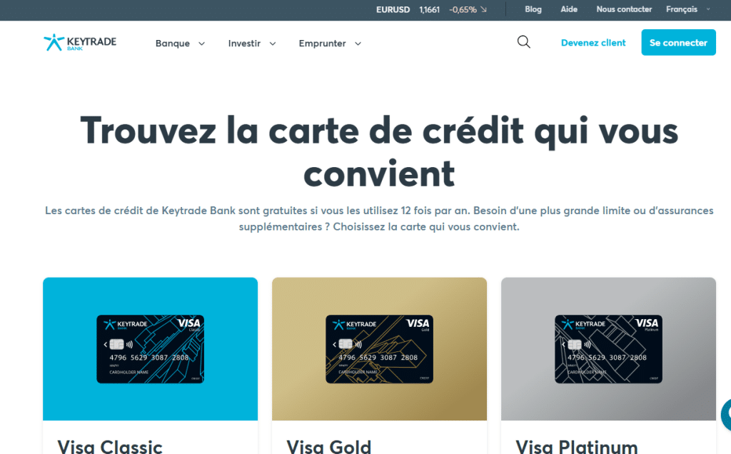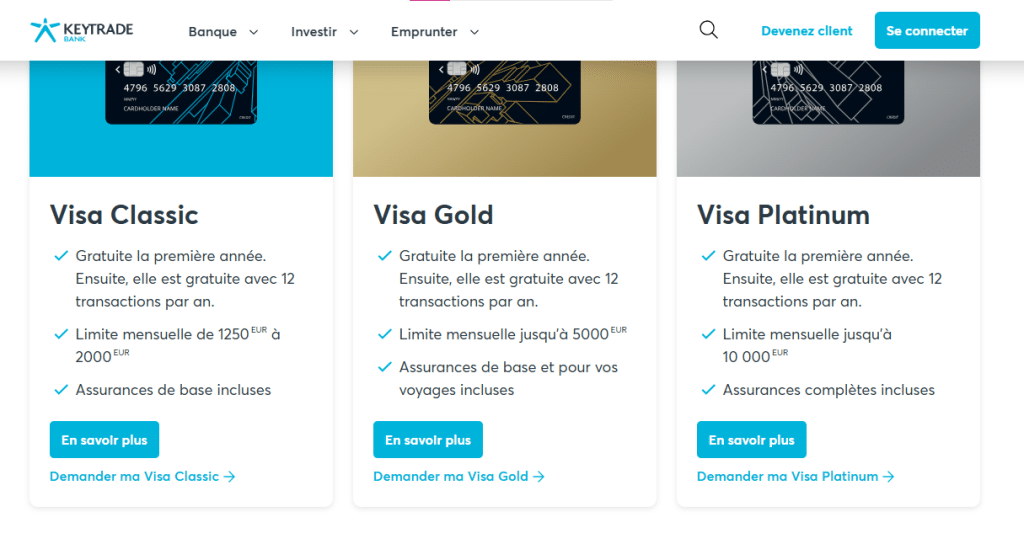 Keytrade propose une gamme de cartes de crédit adaptées aux besoins variés de sa clientèle. La banque offre plusieurs types de cartes Visa, chacune conçue pour répondre à des besoins spécifiques, qu’il s’agisse de paiements quotidiens ou de transactions plus importantes.
