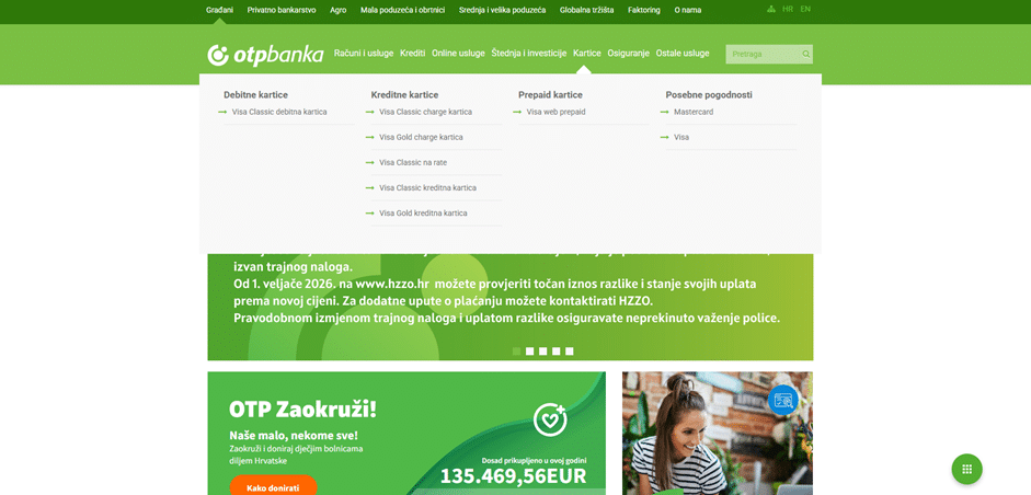 Kezdésként nyissa meg a bank hivatalos oldalát a otpbanka.hr címen. A főmenüben válassza a második lehetőséget: „Kartice” (Kártyák), majd kattintson az első sorra: „Kreditne Kartice” (Hitelkártyák).