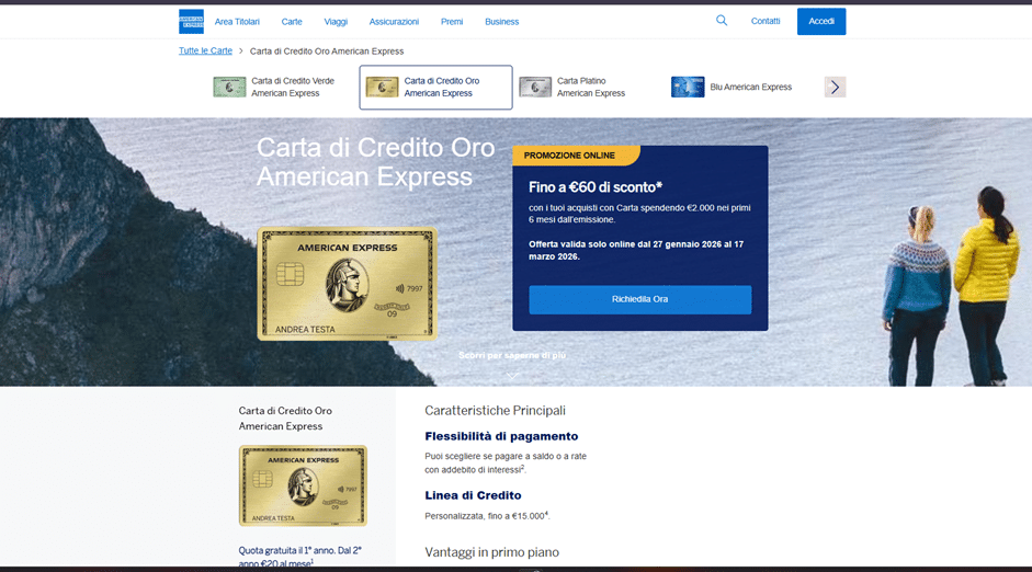 Nella pagina di panoramica, vedrai diverse opzioni come la Carta Platino o la Carta Explorer. Cerca la Carta Oro American Express (solitamente la seconda opzione) e clicca su “Scopri di più” per consultare i dettagli.