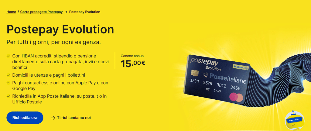 Puoi richiedere la Postepay Evolution online sul sito di Poste Italiane o presso un ufficio postale.