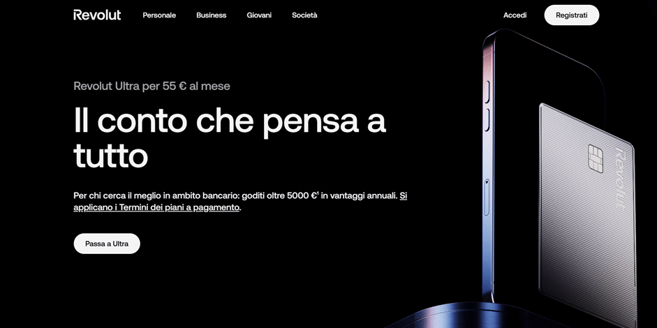 Revolut Ultra è il piano premium di Revolut. Offre carte fisiche e virtuali, assicurazioni di viaggio, accessi ai lounge degli aeroporti e molto altro. È ideale per chi viaggia spesso o lavora all’estero.