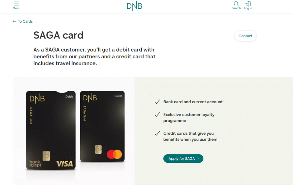 Hvis du oppfyller kravene, klikker du på knappen “Søk om SAGA” på kortets nettside. Du blir deretter sendt til DNBs søknadsportal.