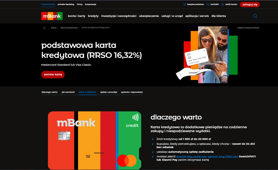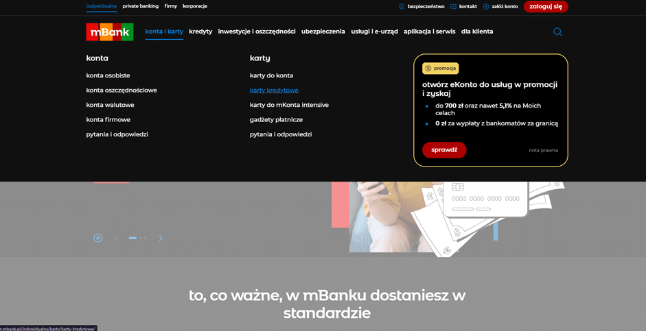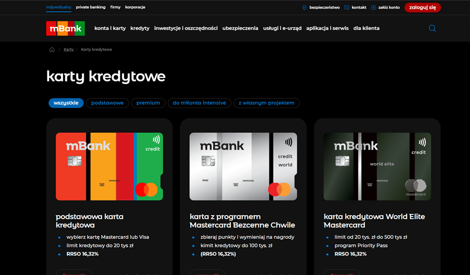 Strona z kartami kredytowymi mBank.