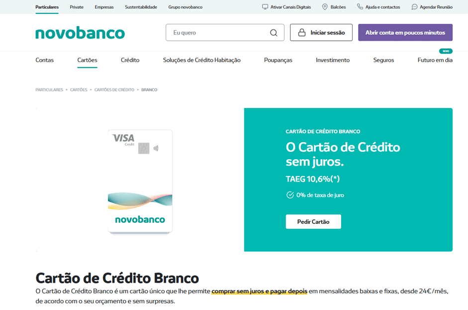O primeiro passo é aceder ao portal do NOVO BANCO pelo endereço www.novobanco.pt. No menu superior, localize a segunda aba chamada “Cartões” e escolha a primeira opção da lista: “Cartões de Crédito”.