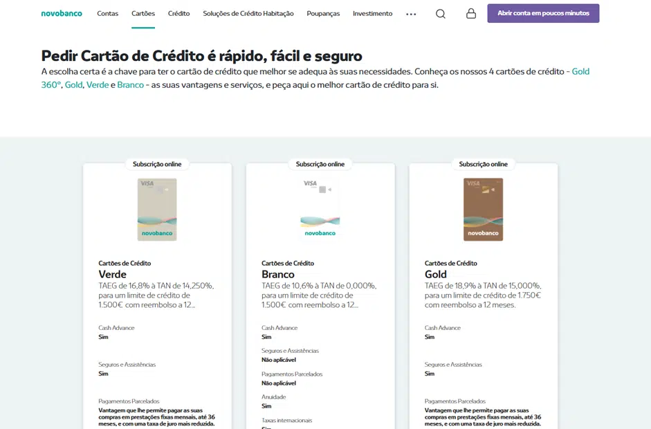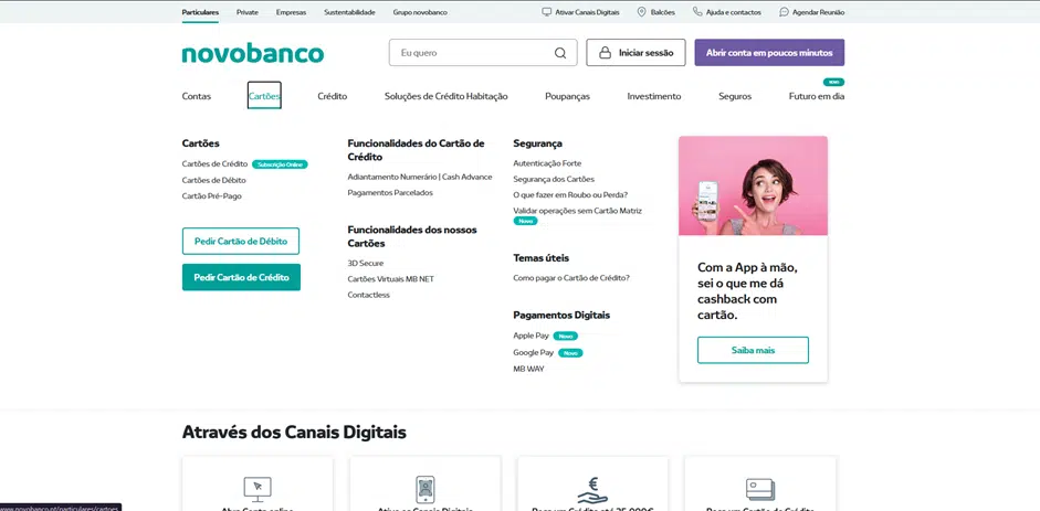O primeiro passo é aceder ao site oficial em www.novobanco.pt. No menu superior, passe o rato ou clique na segunda opção, onde diz “CARTÕES”, e depois escolha a primeira alternativa: “Cartões de Crédito”.
