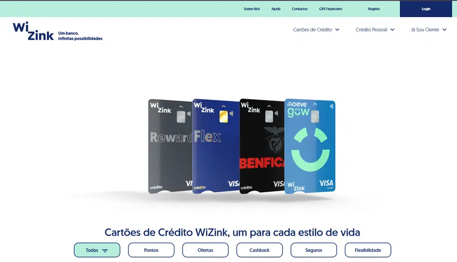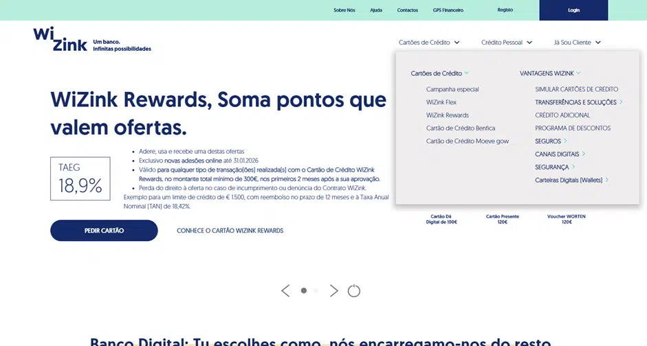 O primeiro passo é entrar na página principal do banco em www.wizink.pt. No menu superior, clique na segunda opção, que diz “Cartões de Crédito”.