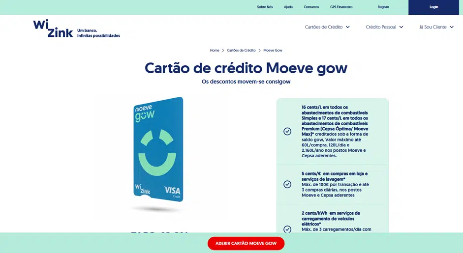 Ao abrir a página com a gama de cartões, deslize para baixo. Irá ver várias opções, como o WiZink Rewards ou o Flex. Procure a quarta opção da lista, correspondente ao Cartão Moeve Gow, e clique no botão verde onde diz “Saber mais”.